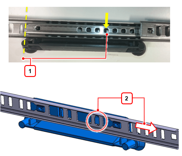 1 - Kada je šina poravnana kako je prikazano na slici, zasun za pritiskanje nalazi se u rupi označenoj na slici
