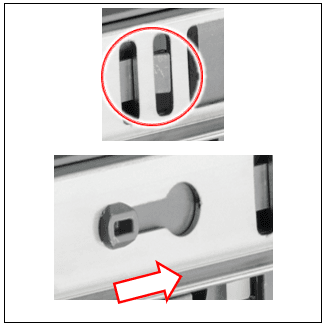2 - Pritisnite zasun i pomaknite šinu u smjeru prema prednjem dijelu perilice posuđa. Taj bi pokret trebao biti dovoljno mali da samo otpusti šine iz kade