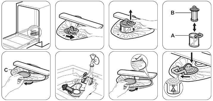 - Покушајте да очистите филтере машине за прање судова ( такође велики филтер око филтера у средини ) и уверите се да нема остатака хране или остатака у или око дна фиоке. Затим покушајте да поново покренете уређај.